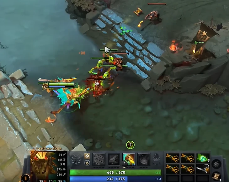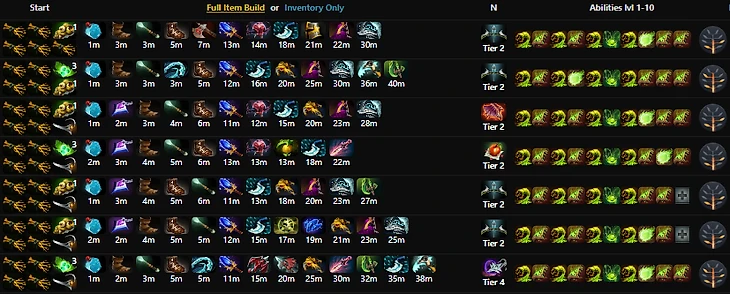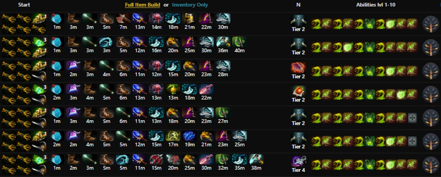 Отсюда и билд: Bottle, Power Treads для скорости атаки, Null Talisman из стартовой Circlet для манарегена и выход в Aghanim’s Scepter. Скиллбилд тоже простой: максим Plague Ward, затем Poison Sting. Venomous Gale берем на 8-м уровне в единичку, по ситуации на 4-м уровне, если можем с ним сделать фраг.