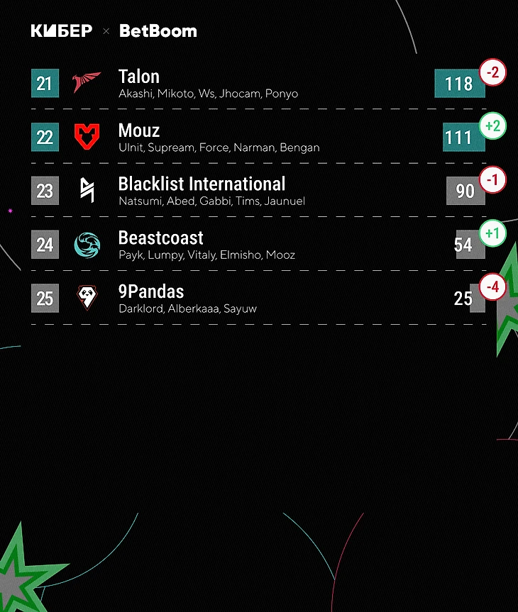 1-2. Панды, VP и Shopify все еще имеют кор из трех игроков на Liquipedia, команды получили штраф за потерю двух игроков на турнирах, где принимали участие. Если бы в составе было два игрока, то они бы в рейтинг не включались. Не всегда получится определять существует ли состав только на бумаге, поэтому все случаи рассматриваются одинаково.