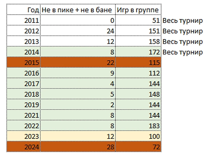 Получается, Инт можно назвать нормальным, правильным, когда не используют около 7-10 героев. Выделил такие турниры светло-зеленым.