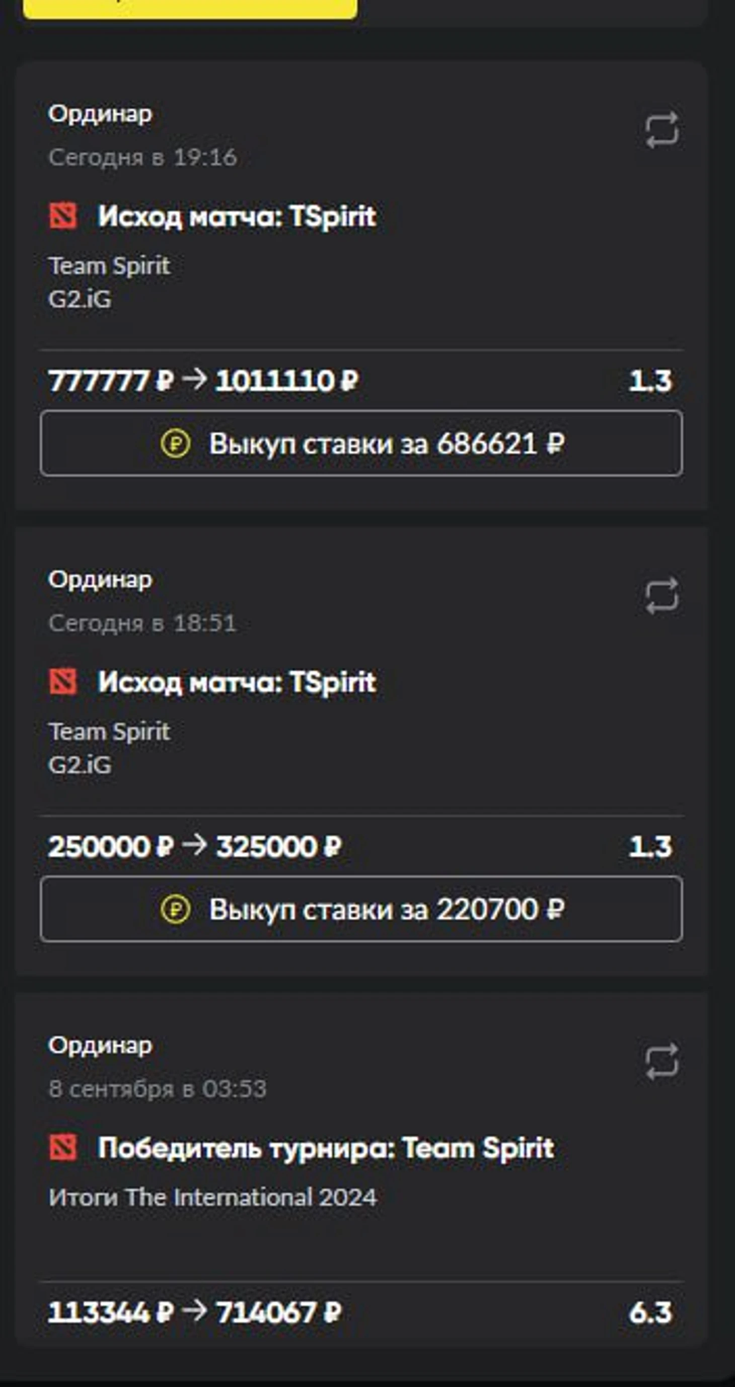 8 сентября Влад выложил в своем телеграме пост «Погнали. Верю в тиммейтов». И показал ставку – 113 344 рубля на победу Spirit на TI: