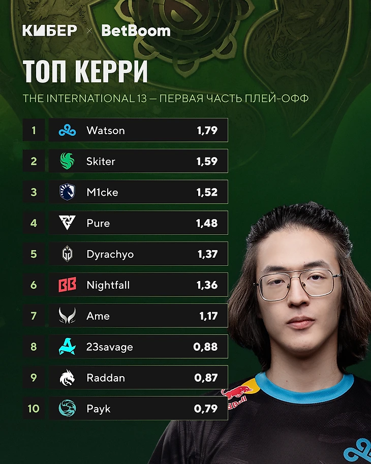 ● Cloud9 в верхней сетке TI! Команде достались удобные соперники – 1win и Aurora, но даже с более сложными оппонентами состав показал бы очень высокий уровень игры. Если в групповом этапе Watson был лишь шестым керри, то в плей-офф стал лучшим с большим отрывом: рейтинг 1,79 против 1,59 у второго Скитера. Noone и Dm лучшие на своих ролях, саппорты попали в топ-5: 1,22 у Kataomi и 1,07 у Fishman.