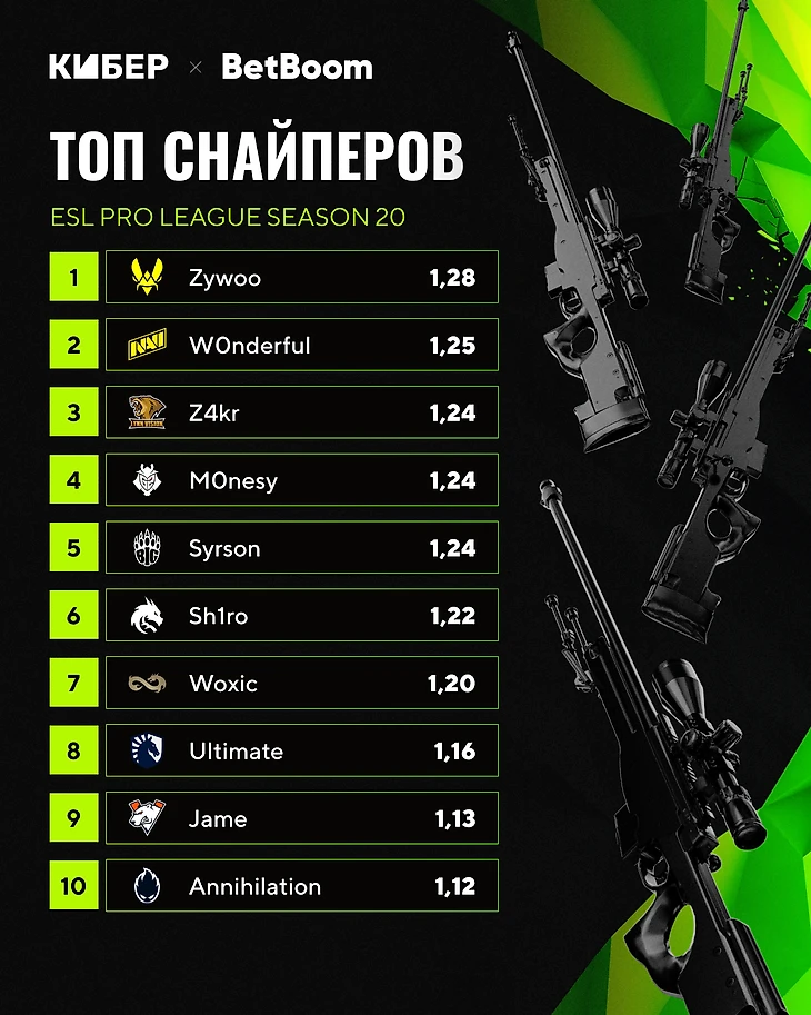 ● В топ неожиданно попал снайпер Lynn Vision – Z4kr. Он стал третьим снайпером турнира и четвертым в общем списке. Десятым снайпером стал игрок Atox Annihilation, его команда также не вышла в плей-офф.