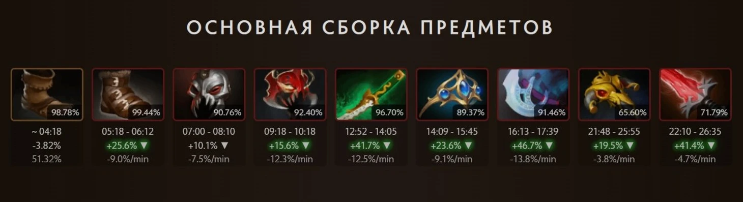 В любом матче на первые деньги выходим в Стик или Wraith Band в зависимости от вражеской линии. Часто можно взять и то, и другое. Дальше Power Treads и обязательную Mask of Madness. Иногда Dragon Lance в будущий Hurricane Pike смотрится на Луне крайне хорошо, но я не думаю, что это – обязательный предмет в сборке. Здесь все критически зависит от ситуации и драфта противника.