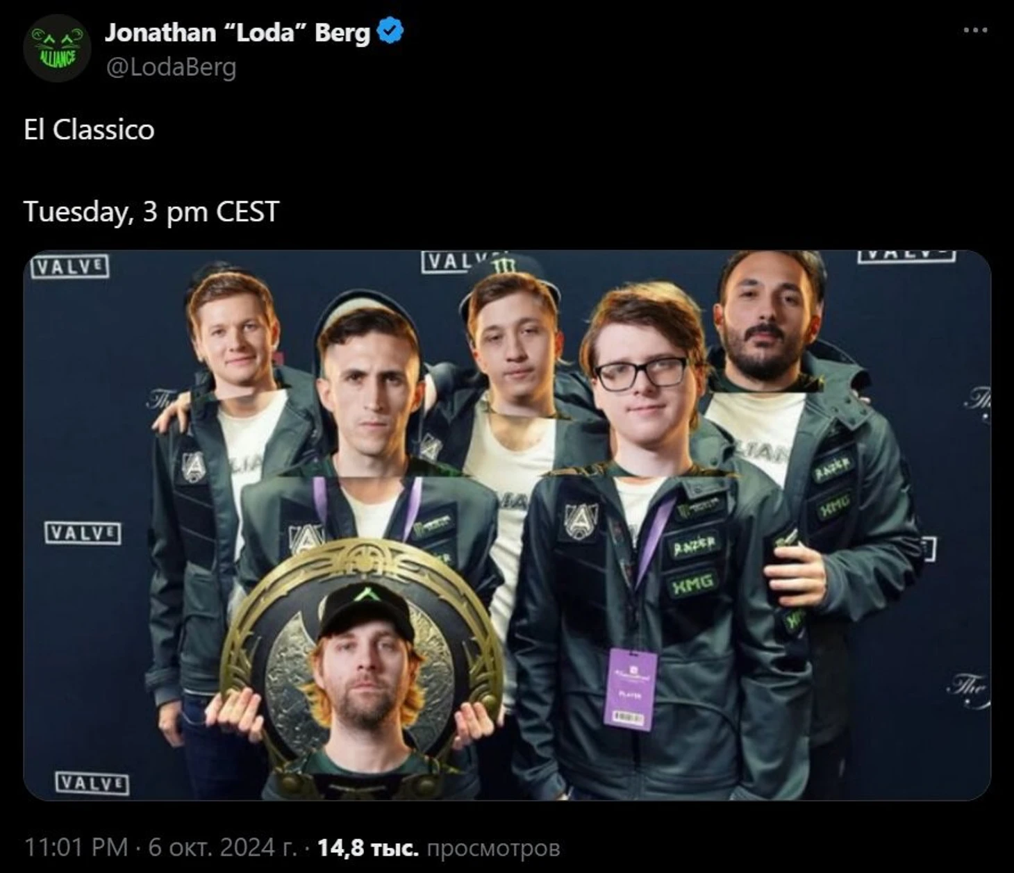 Тренер шведской команды Джонатан «Loda» Берг тоже выложил забавную картинку – чемпионское фото с TI3 с лицами нового состава и самим собой в центре чемпионского Аегиса. Только «Эль-Класико» Джонатан почему-то написал с ошибкой.