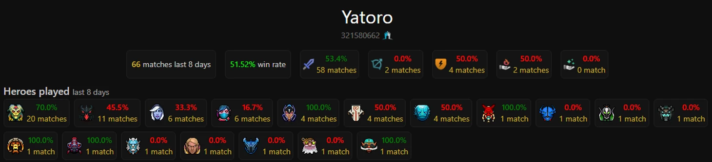 В Доту, разумеется, Яторо играть не перестал. Вот так выглядит история матчей человека, ушедшего в отпуск.