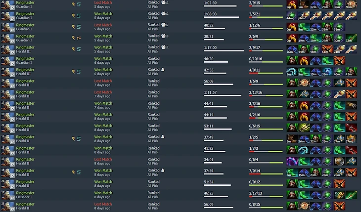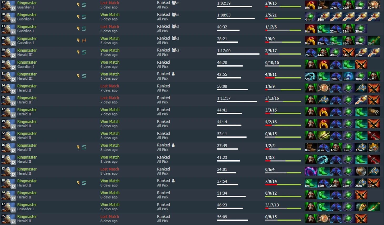 С момента выхода Рингмастера Андрей наиграл на нем уже 600 матчей. Судя по истории, Рингмастер берется всегда, если не улетает в бан.