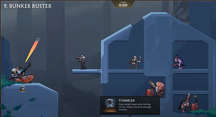 Настраиваем угол с силой, как на скриншоте, и взрываем огра. Затем выбираем Tunneler и стреляем под тем же углом, но на два деления слабее. Скелеты падают вниз, а мы закидываем туда гранату с той же силой, что и Tunneler.