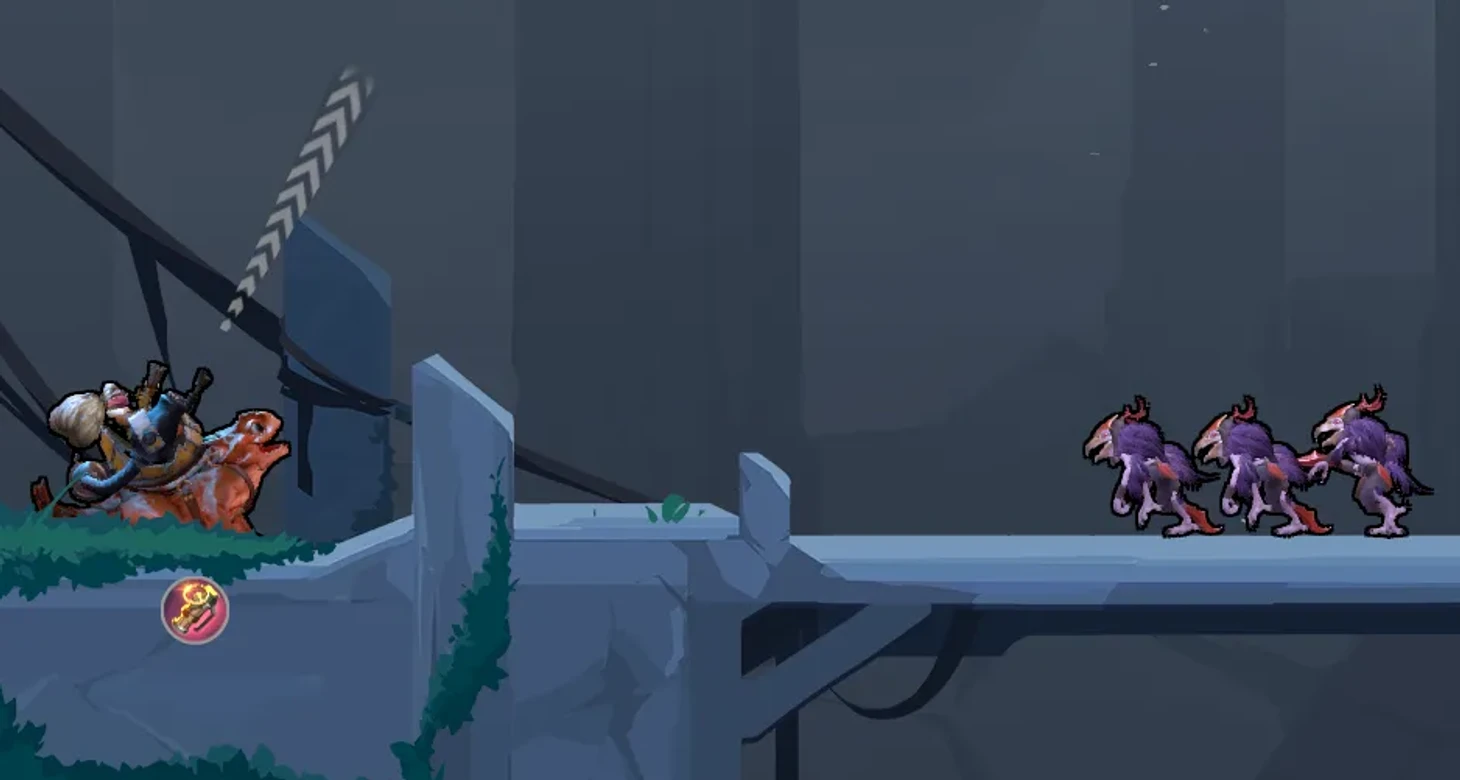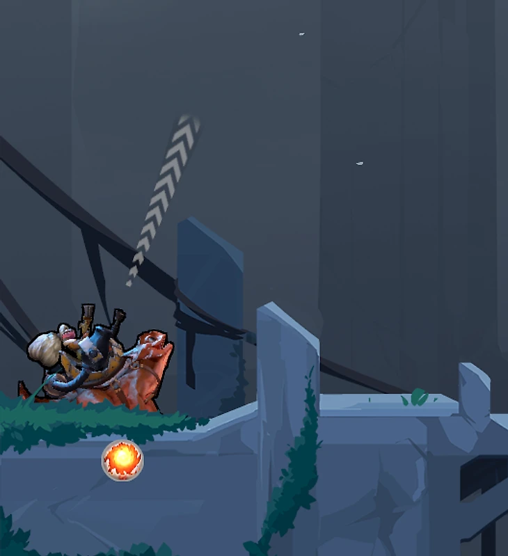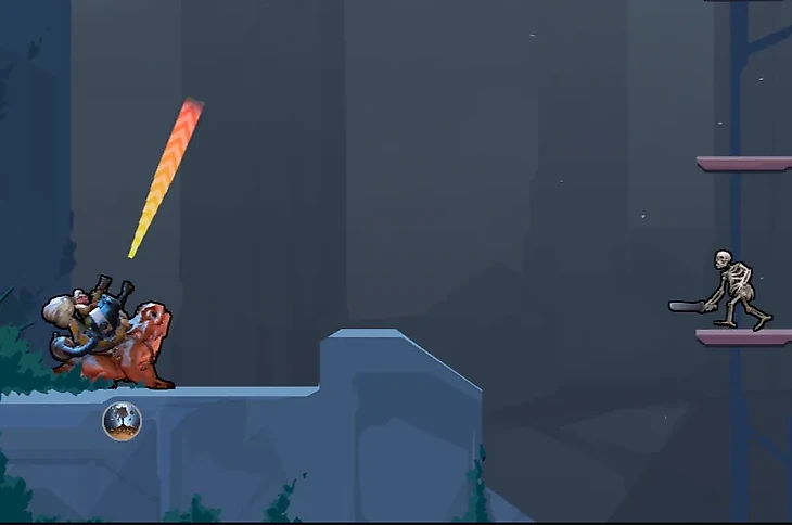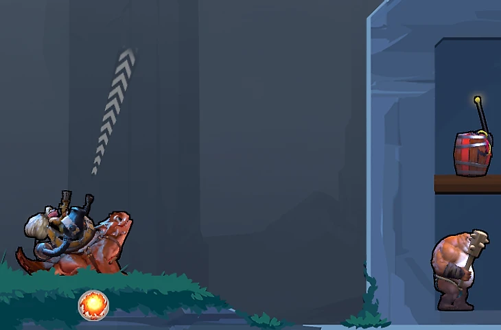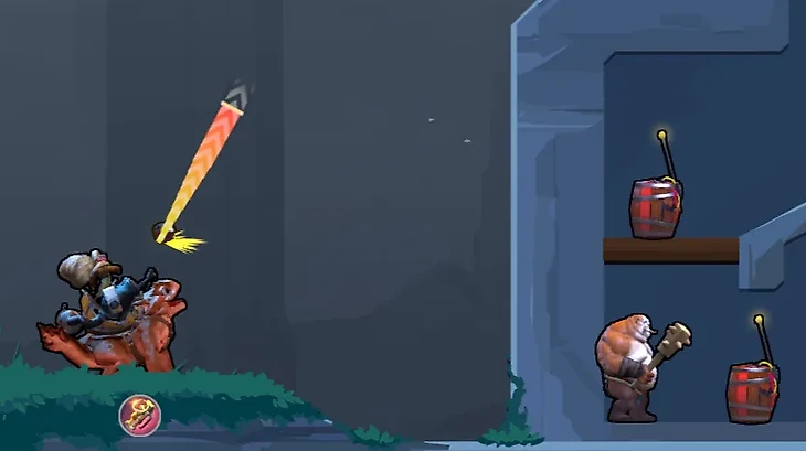 На старте уровня моментально заряжаем гранату на полную под таким углом. Так мы убьем сразу двух огров. Затем аккуратно, по одной гранате убиваем скелетов. Если не попали, но подорвали красный мост – подождите, пока скелет свалится.
