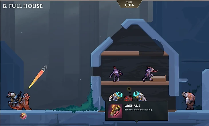 После этого берем Grenade и под тем же углом закидываем огров. Как и на первые две башни: сначала чуть больше половины полоски, на второго – 3/4 полоски.