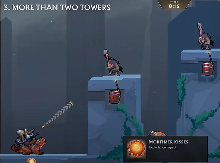 Сначала выбираем Mortimer Kisses, чтобы взорвать бочки в башнях. Целимся в уголок первой башни, как на скриншоте. Для остальных башен подойдет тот же угол. Первый раз заряжаем чуть больше половины полоски, второй – 3/4 полоски. На третью башню отпускаем выстрел за одну отсечку до максимума.