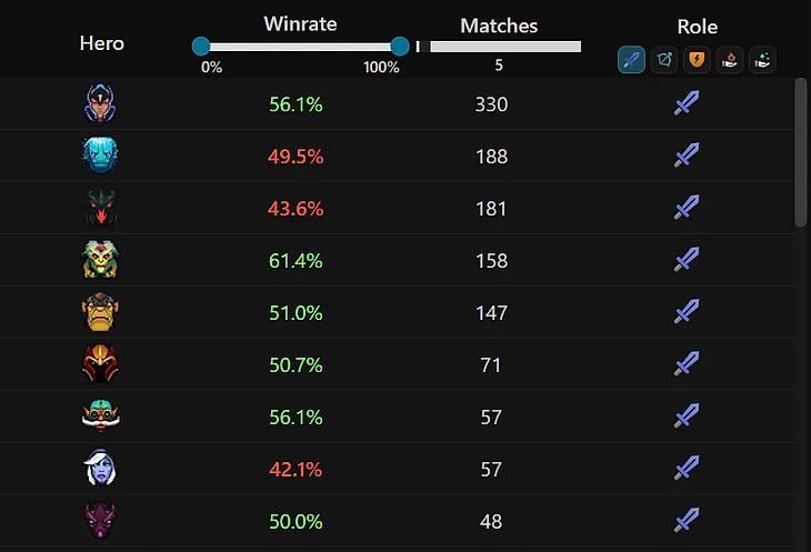 Первые игры у Никиты на ТБ-тройке датируются 1-м ноября – он активно обкатывал героя на стриме. С тех пор у Дахака 14 игр в пабликах на Террорблейде с оффлейна, из них 11 – победы. Больше всего в ранкеде на герое сыграли: