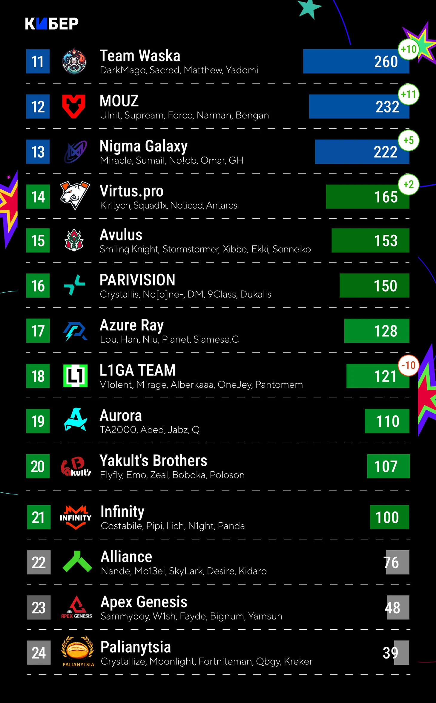 ● Обнулились очки у BetBoom Team, Xtreme, Aurora, G2 x IG, Cloud9, PSG Quest, OG, LGD, NAVI, так как команды потеряли костяк игроков. Текущее место клубов в рейтинге – результат на BetBoom Dacha Belgrade, PGL Wallachia 2 и DreamLeague 24.