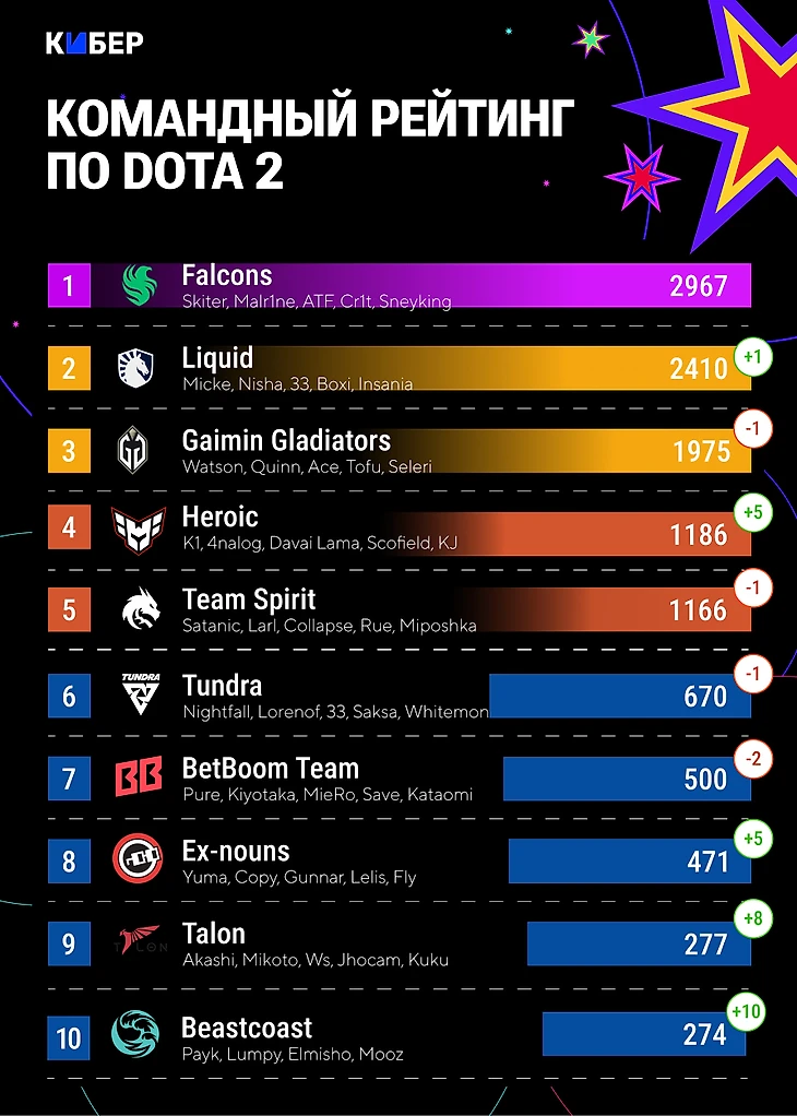 С The International прошло два месяца, а команды наконец-то закончили активную фазу замен. В первом рейтинге нового сезона достаточно изменений: множество команд вылетело из топа из-за потери костяка игроков, освободившиеся места заняли новые клубы.