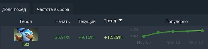 Пусть вас не удивляет длина списка, ведь когда герой только вышел, он был абсолютно сломан. И пусть вас не смущают шутки первых дней релиза про винрейт <30. Процент побед за пару дней нормализовался и непрерывно рос, особенно на очень высоком рейтинге.