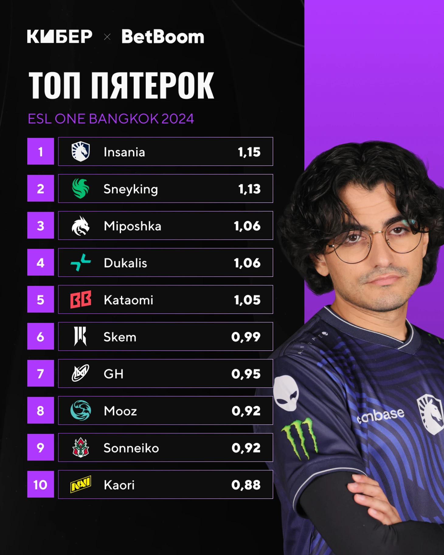 ● Три игрока Liquid заняли в рейтинге топ-2 по своим ролям. Insania – лучшая пятерка с 1,15, а вот у Сайберлайта лишь шестое место и рейтинг меньше единицы.