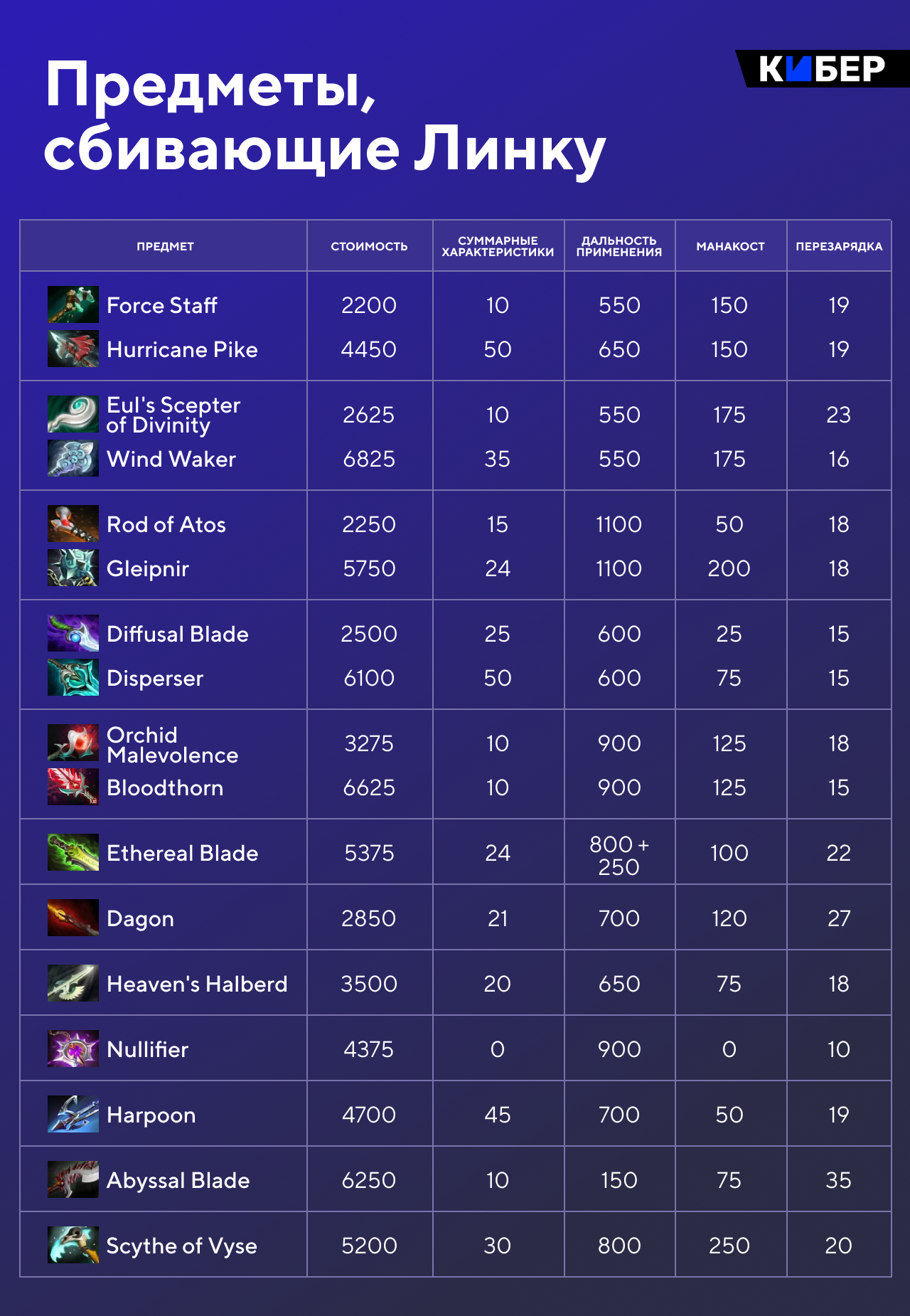 Чтобы разобраться, я подготовил наглядную табличку со всеми предметами, которые сбивают Линку:
