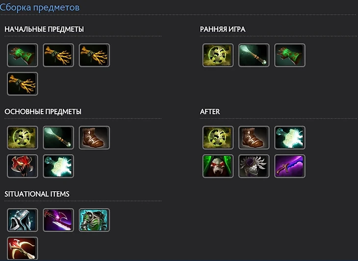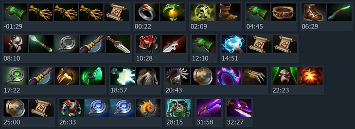 Основной билд строится вокруг стартовой Gloves of Haste, которую он превращает в Orb of Corrosion, что компенсирует низкую скорость атаки и броню. После чего стандартные Magic Wand и Power Treads, а после – Mask of Madness, которая тоже компенсирует скорость атаки. Урона с руки уже к этому моменту достаточно и есть какой-никакой стан.