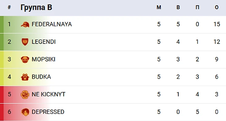 Группа B также не обошлась без интриг. MOPSIKI, уверенно побеждают DEPRESSED KIDS и NE KICKNYT, и прокладывают себе путь в плей-офф, выйдя из группы на третьем месте Позже DEPRESSED KIDS технически проиграла команде LEGENDI из-за проблем с интернетом у капитана команды Глеба kiyotaka Зырянова.Команда FEDERALNAY, не знавшет поражений, и обыгрывает команду LEGENDI выйдя из группы с первого места.Команда BUDKI выходят с четвертого места набрав шесть очков.