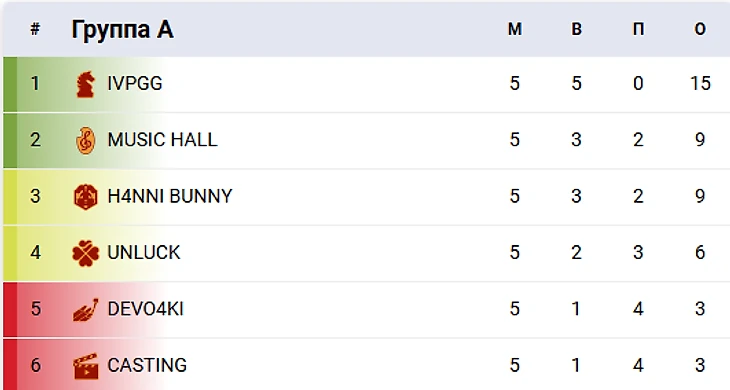 В группе А команда IVPGG показала отличные результаты, завершая групповой этап на первом месте. H4NNI BUNNY также продемонстрировала достойную игру, выйдя на втором месте. Жаль, что CASTING и DEVO4KI не смогли справиться с давлением и покидают турнир, в то время как UNLUCK завершает свои усилия на четвертом месте, а MUSIC HALL на третьем