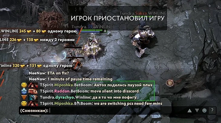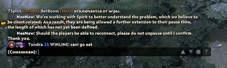 У каждой команды по правилам есть всего лишь 10 минут паузы. Поправить интернет, поменять компьютер, решить вопросы с настройками или FPS – все обязательно нужно успеть. В теории команда противника может поделиться своей паузой. Собственно, Tundra так и поступила. Дурачье привычно сообщил, что ему пофигу.