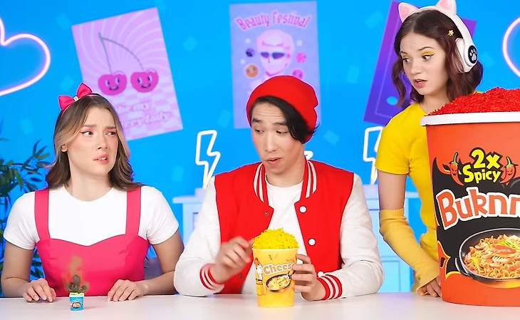 А парень в кадре подшутил над Дарьей и облил ее молоком, пока она запивала острую лапшу.