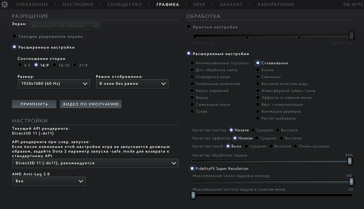Если не страшно играть в Доту без крутой графики, то снимите все галочки и снижайте качество текстур, теней и эффектов до среднего или низкого уровня. Для совсем отчаянных: выкручиваем «Качество обработки экрана» на 99% и ставим галочки на FidelityFX Super Resolution и «Сглаживание».