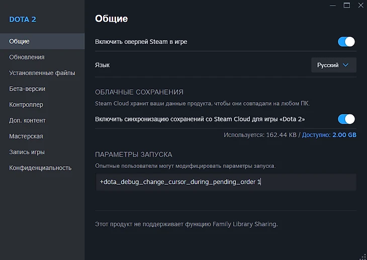 И снова совет от разработчика: можно поэкспериментировать с добавлением команды «+dota_debug_change_cursor_during_pending_order 1» в командную строку Доты. Скопируйте ее в параметры запуска. ПКМ по Доте в Steam, далее заходим в Свойства и вставляем скопированную команду в окошко для ввода.