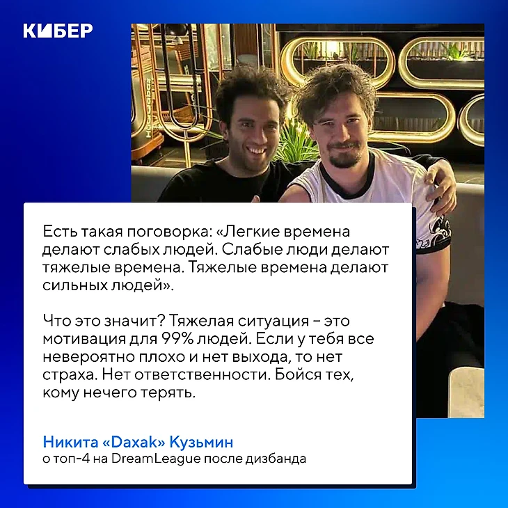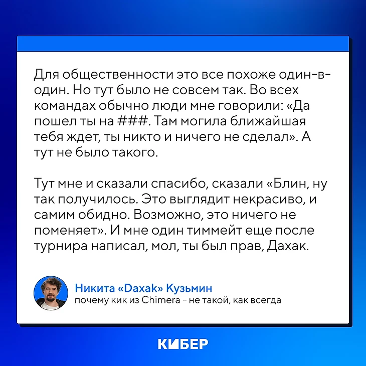 – Я сказал, что для общественности это все похоже один-в-один. Но тут было не совсем так. Во всех командах обычно люди мне говорили: «Да пошел ты на ### [все четыре стороны]. Там могила ближайшая тебя ждет, ты никто и ничего не сделал». А тут не было такого. Тут мне сказали спасибо. Сказали: «Блин, ну так получилось. Это выглядит некрасиво, и самим обидно. Возможно, это ничего не поменяет». И мне один тиммейт еще после турнира написал, мол, ты был прав, Дахак. То есть это морально и для меня, и для команды было по-другому.