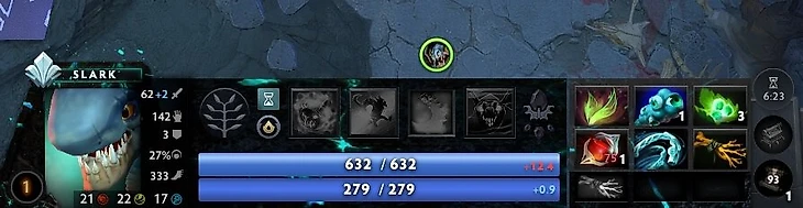 1. Приятные размены на линии за счет Essence Shift и быстрого восстановления здоровья от врожденной способности Barracuda. Во многом из-за этого у Сларка практически нереально забрать ранние объекты (лотусы или Алтарь мудрости) в одиночку. Сларк обожает вгрызаться в одиночную цель со старта!