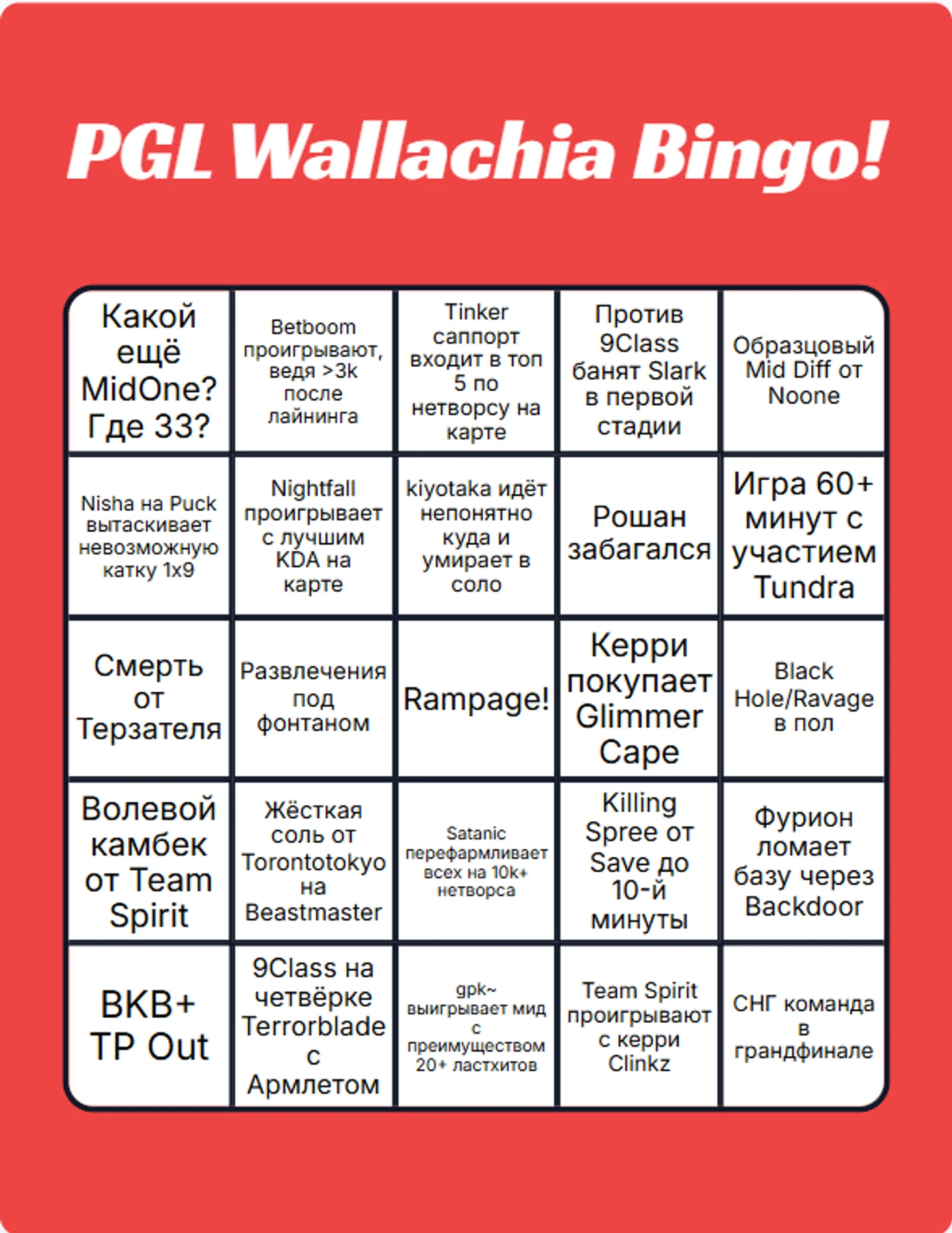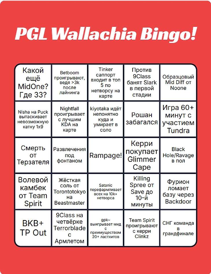 Поэтому, чтобы просмотр очередного матча Spirit/Liquid/Pari/BB имел чуть больше смысла - предлагаю сыграть в специально подготовленное к турниру бинго.