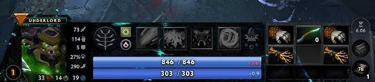 Теперь персонажу даже не нужен какой-то переходный предмет для фарма, ведь у него есть соответствующий аспект. Ну и сама по себе пассивная способность Atrophy Aura. Которая мало того, что дает Андерлорду кучу урона и, как следствие, фарма, так еще и снижает кор-потенциал всех противников – -30% белого урона (с талантом 20-го уровня – -40%!) это не шутка на любой стадии игры. Идеальная способность, которую гарантированно хотел бы любой керри.