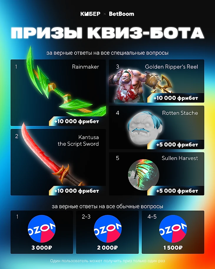 Квиз-бот врывается на DreamLeague Season 26! Каждый день отвечай на вопросы про Доту и турнир и участвуй в розыгрыше классных призов, которые мы подготовили вместе с нашими друзьями из BetBoom.