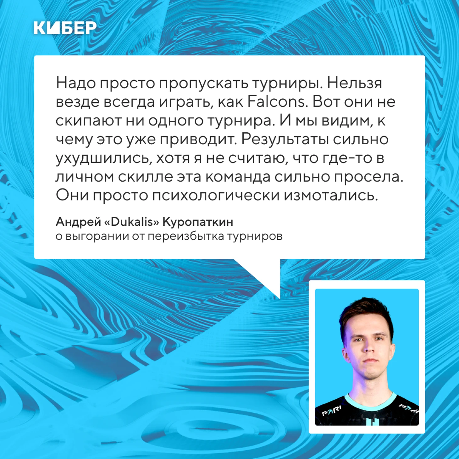 – А на самом деле все просто. Вот мы приехали на Wallachia, чувствовалась усталость. Но не было такого, что мы полностью выгорели. Потому что мы до этого скипали предыдущую Wallachia. Надо просто пропускать турниры. Мне кажется, что нельзя везде всегда играть, как Falcons.