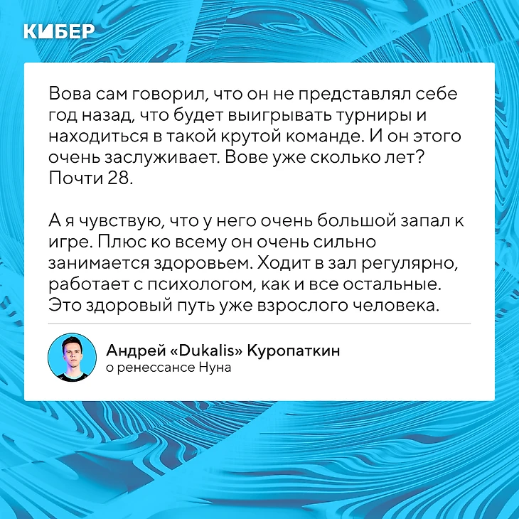 Вообще Вова сам говорил, что он не представлял себе год назад, что будет выигрывать турниры и находиться в такой крутой команде. И он этого очень заслуживает. Вове уже сколько лет? Почти 28. А я чувствую, что у него очень большой запал к игре. Плюс ко всему он сильно занимается здоровьем. Он ходит в зал регулярно, работает с психологом, как и все остальные. Это здоровый путь уже взрослого человека.