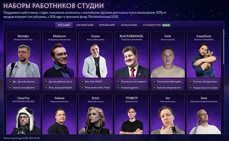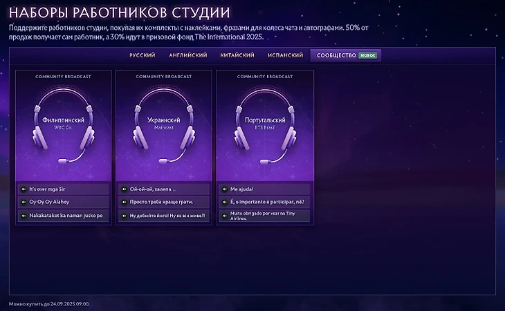 «Официальная трансляция The International ведется на четырех языках, однако даже этого недостаточно. Фанаты по всему миру собираются вместе, чтобы поддержать локальные сообщества на своем языке, поэтому мы впервые вводим комплекты поддержки для крупных неофициальных эфиров. Наш выбор пал на тех, у кого в этом году было больше всего зрителей: это бразильский португальский, филиппинский и украинский языки. Как и в случае с отдельными комплектами поддержки, 50% от продаж получит выбранная организация, а 30% пойдут в призовой фонд.