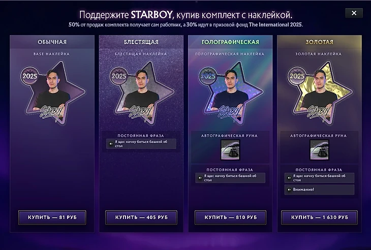 «Чтобы воздать почести игрокам и работникам трансляций, в этом году мы, не нарушая традиции The International, вновь открываем продажи комплектов поддержки. Каждый из них содержит контент, созданный работником студии или командой, будь то загрузочные экраны, наклейки, реплики для колеса чата и прочее. 50% от продаж получают те, чей комплект вы приобрели, а еще 30% в этом году идут в призовой фонд турнира».