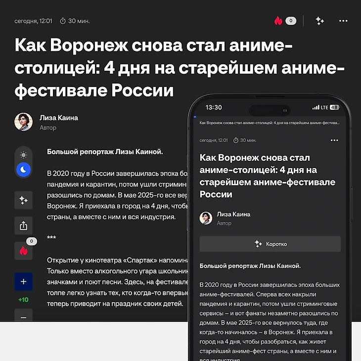 Привет! Вы наверняка заметили, что в последнее время страницы постов в разделе «Железо» и CS на Кибере стали выглядеть иначе. Теперь – обновленный внешний вид и функционал на всем сайте. Рассказываем о всех изменениях на примере репортажа с аниме-фестиваля в Воронеже.