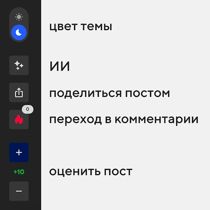 Эта панель отображается слева поста на десктопной версии и внизу – на мобильной. Теперь в любой момент можно поставить плюс/минус посту, поделиться им в соцсетях или перейти в раздел комментариев – больше не нужно пролистывать текст до самого конца.