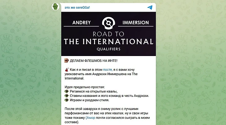 Инициатором подобного флешмоба стал стример Сергей «Seregga» Жаркой. 22 мая в своем телеграме он призвал подписчиков регистрировать команды в открытых квалификациях на TI с лого и названиями честь Андрея Иммершена. Так он захотел увековечить никнейм игрока.