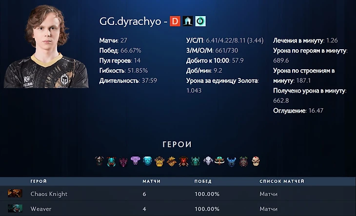 А знаете, какие герои были лучшими у Антона на 12-м Инте? Chaos Knight и Weaver, на обоих он не проиграл ни разу.
