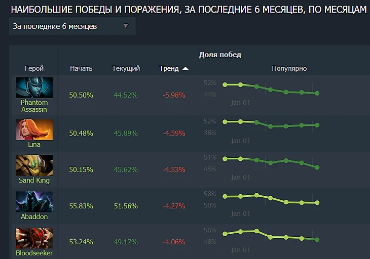 Возьмем, например, Фантомку. Героя нерфят уже 3 патча подряд, ее винрейт стремительно катится вниз. За полгода – с 50 до 44%.