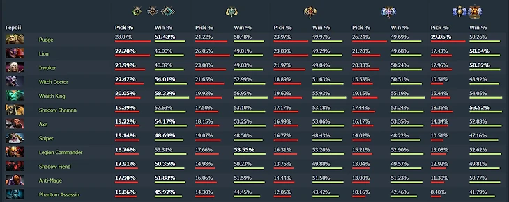 Но герой все еще в топ-12 по пикрейту на рангах «Рекрут», «Страж и «»Рыцарь». Ребята на этом MMR видят ПА каждую шестую катку – из традиционных керри-героев показатель выше только у ВК и Антимага.