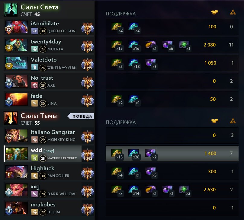 Пример с про игроками не совсем корректный: это КОМАНДНАЯ Дота с разделением ролей внутри команды. Наверняка условный Акке (образный пример с вводами) либо ставил варды сам, либо по договоренности это делал кто-то другой. У вас в закупке я вижу ровно 0 расходников.