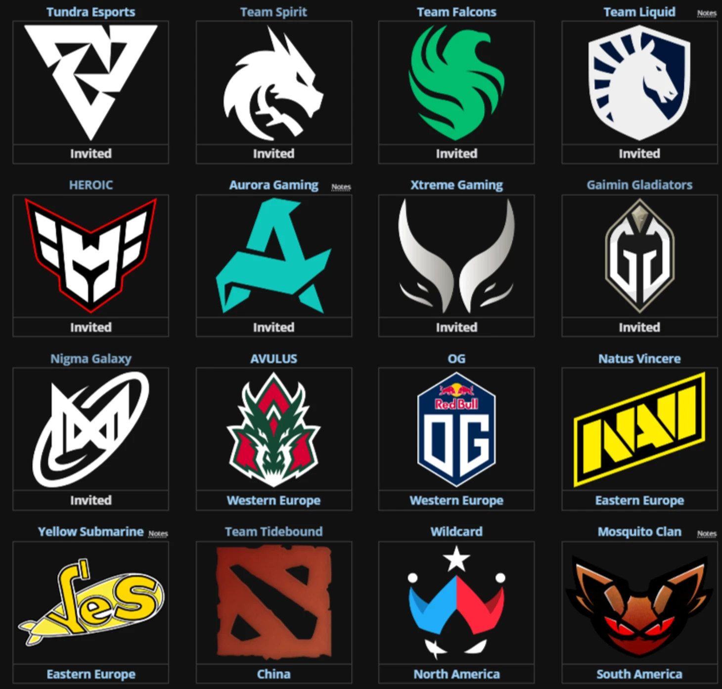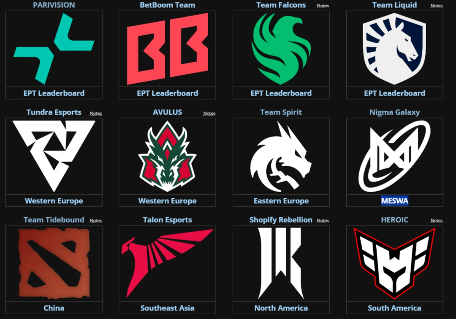 На турнир прямое приглашение получили 3 команды из Восточной Европы (Team Spirit, BetBoom Team и PARIVISION), 3 – из Западной Европы (Team Liquid, Gaimin Gladiators, Team Falcons и Tundra Esports) и 1 из Китая (Team Tidebound).
