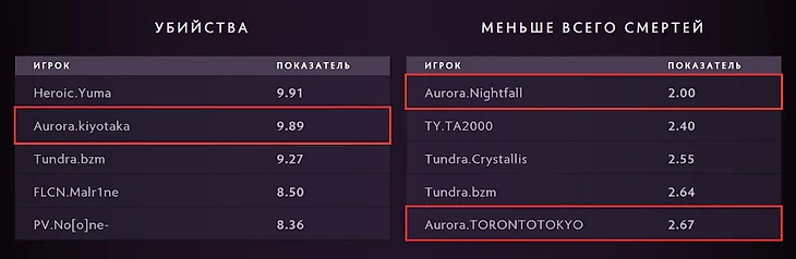Взглянем на показатели убийств и наименьшего количества смертей в среднем – все 3 кора Aurora здесь в топе. При этом Егор и Александр в топе по показателю, который характеризует аккуратность (порой, чрезмерную), а Глеб – в топе по показателю, который отражает агрессию. Тоже, иногда, излишнюю.