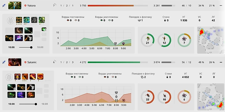 У обоих керри на первой карте были равные линии. Яторо, по своей традиции, взял два Нулика, чем чуть-чуть замедлил тайминг молний. А небольшое преимущество Сатаника обусловлено использованием Devour и двумя ассистами.