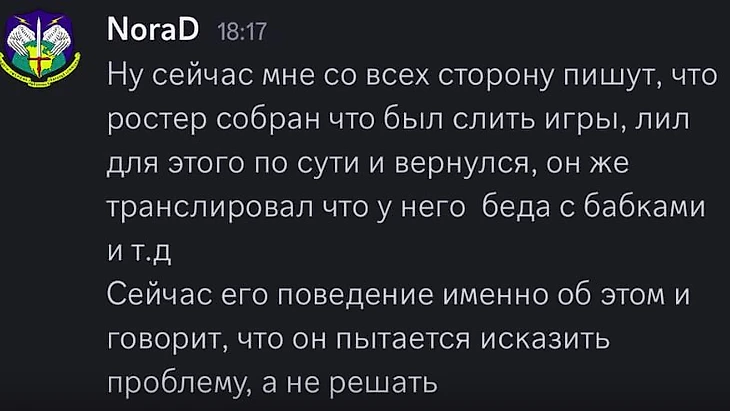 В комментариях к своему сообщению Норад объяснил, что не сливает переписку из-за просьбы ESIC (ассоциация для противодействия мошенничеству в киберспорте)