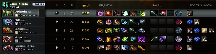 Ближе к мидгейму мы привыкли и уже не забывали о дополнительном доходе. Катка пошла хорошо, мы буквально купались в деньгах всей командой. За 39 минут даже у саппортов было по 5 полноценных слотов. Жаль только, что после игры нельзя посмотреть, сколько денег принесли мешочки от аспекта.