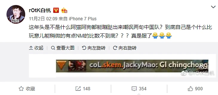 19. Был одним из главных голосов в скандале с Kuku и расистскими оскорблениями и призывал Valve к строгому наказанию: «Теперь все считают, что это нормально так обращаться к китайским командам? Да кто ты ##### [вообще] такой? С меня хватит», – писал он в Weibo.