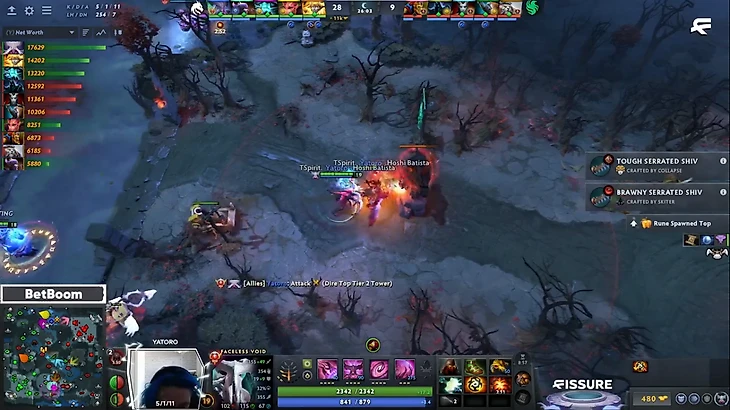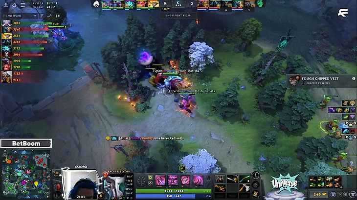 В драке крип тоже был полезен. Уже на одиннадцатой минуте Yatoro напал на вражеского саппорта. Помогал ему прирученный призрак с замедлением. Без него контроля и урона не хватило бы, а Войд бы потратил Хроносферу. За счет крипа удалось сохранить важную способность с долгой перезарядкой.